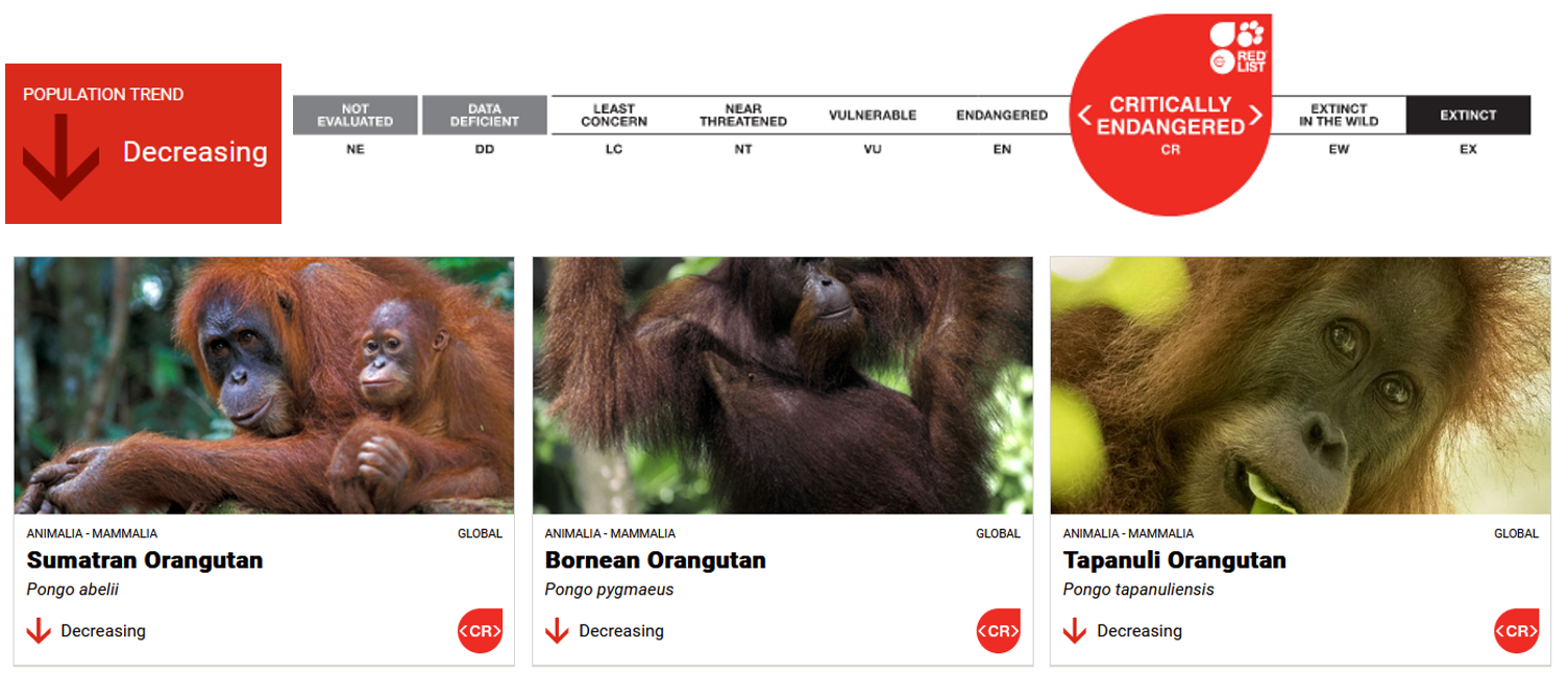 Time is running out! The IUCN Red List has all three species of orangutans listed as CR - Critically Endangered with populations decreasing.